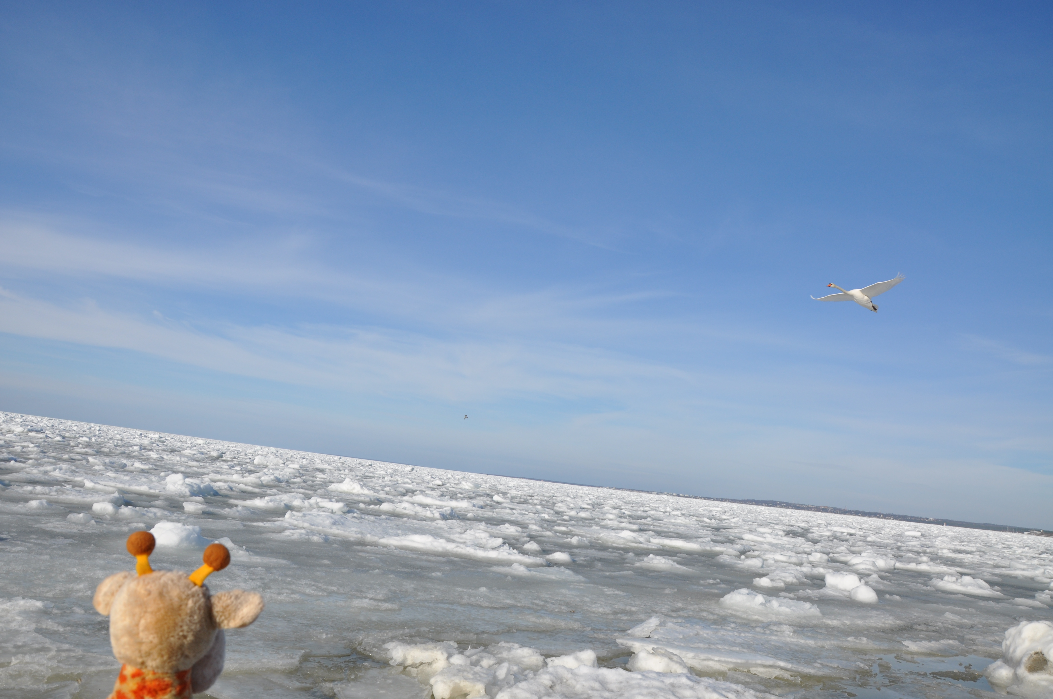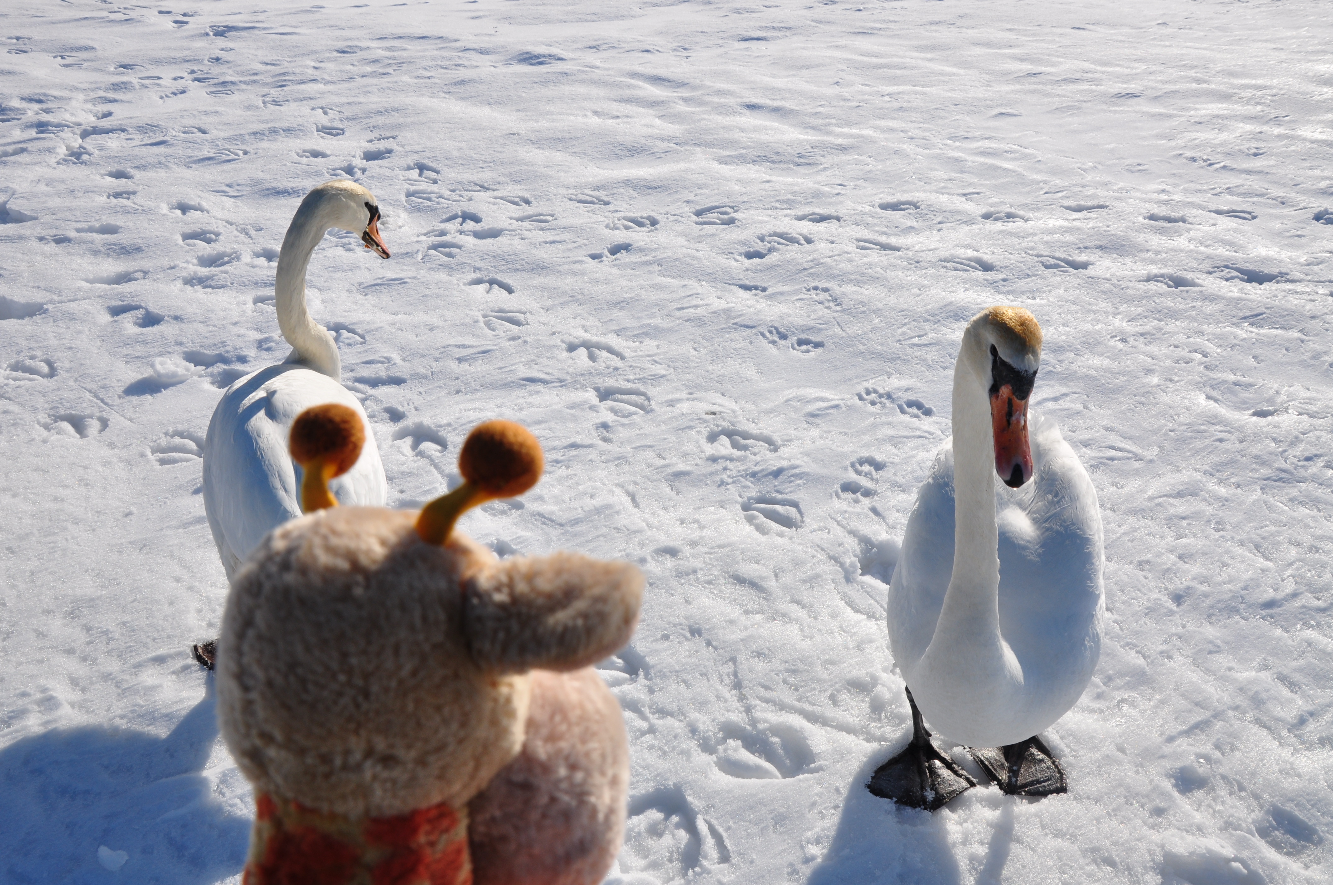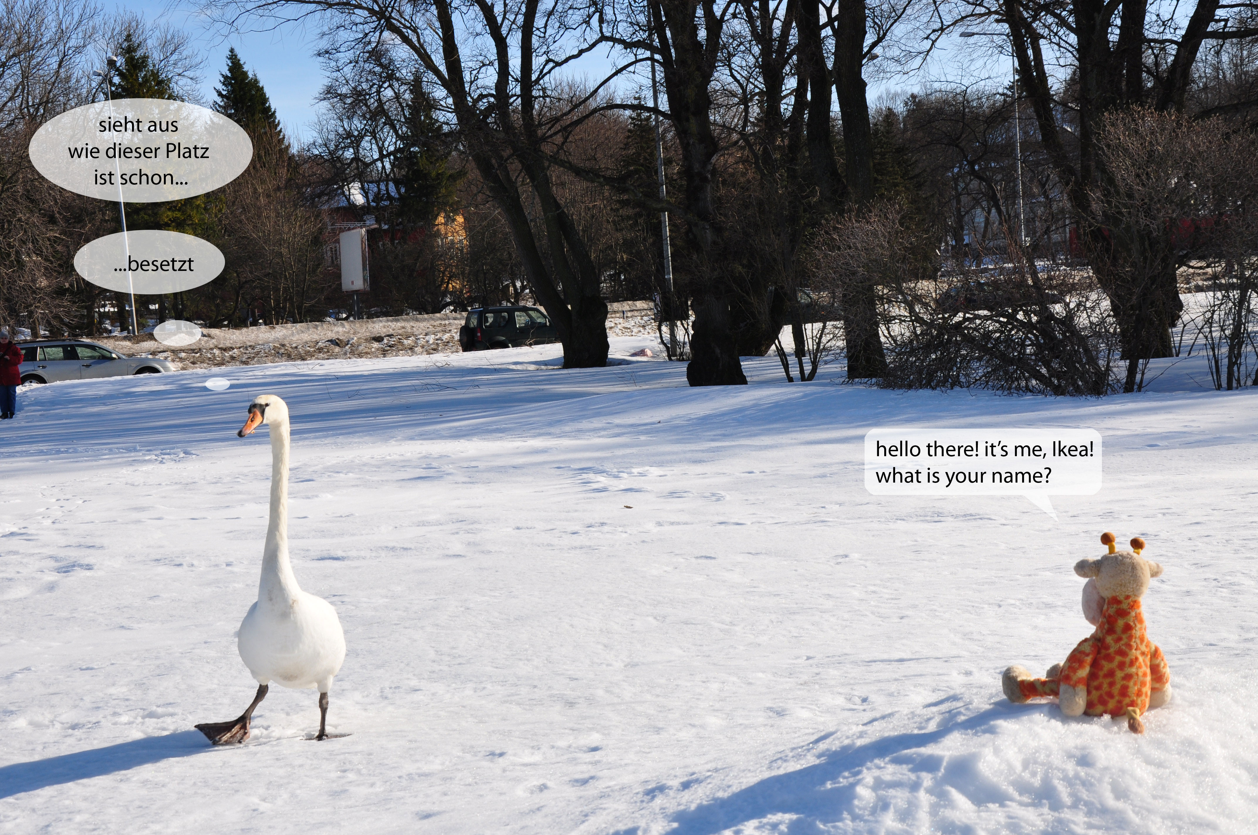 the swans, they were not from Sweden, but from Germany. but this one swan Marie (on the right, that’s the one flying on that other fotograf), she knew a few words in English. that other one, that’s Maximilian. so we talk a little about politics – no i’m just joking :) we actually talk a little about snow and ice. because they tell me that they arrived early this year and somehow there’s not much to do here, because of the snow. especially there’s not enough of free water, so that they can’t swim.. anyways, i thank them because they had to go somewhere with the other swans. then i saw there were almost . A LOT, for a giraffe. what about u, have u seen swan’s lately? what were their names? have fun and c u l8r!