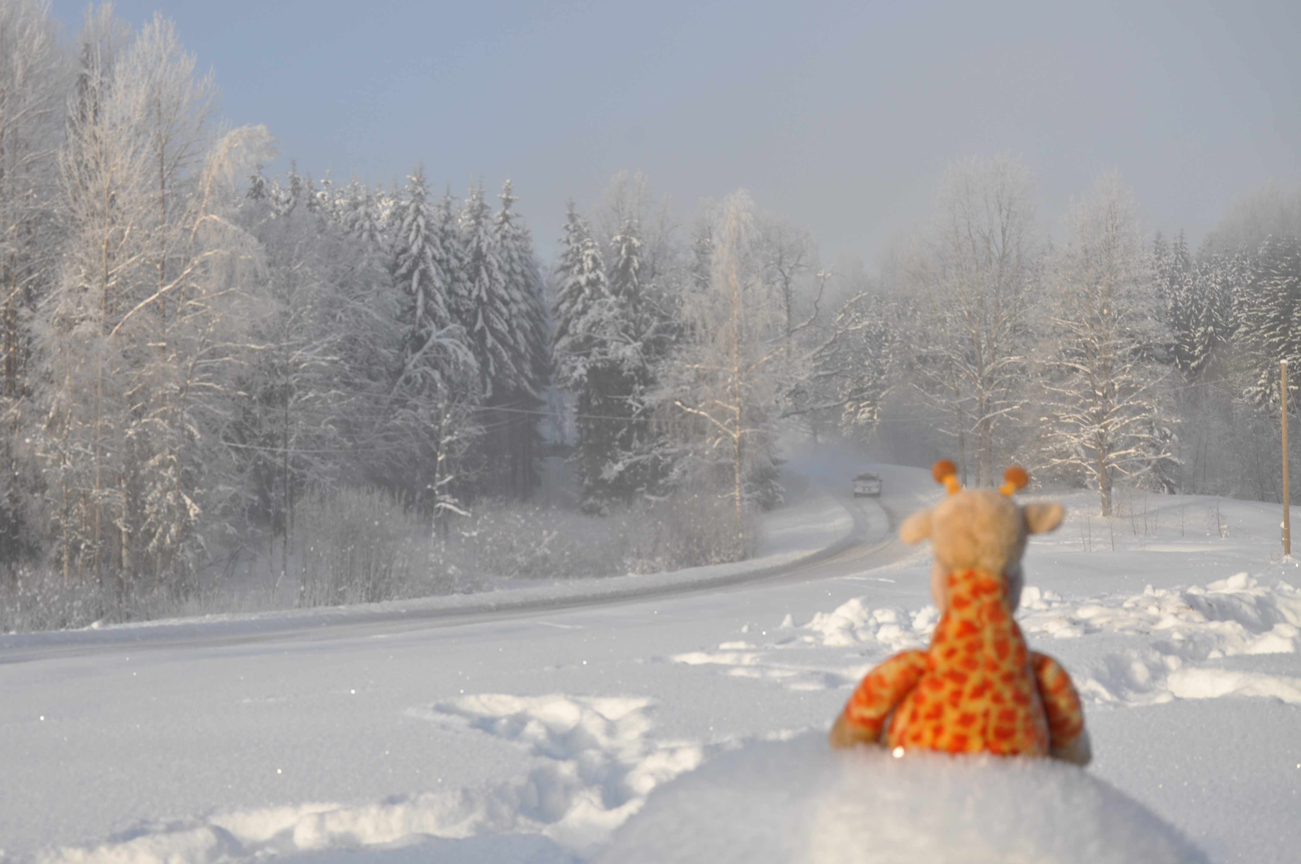 so then, i took some fotografs as well. i have to tell you i was in two places. first i was in a with some proffessional-looking latvian foto people. i did not understand a word. apparently latvian is totally different from anything we, giraffes, speak. so, here i am, waiting for the rally cars to come: